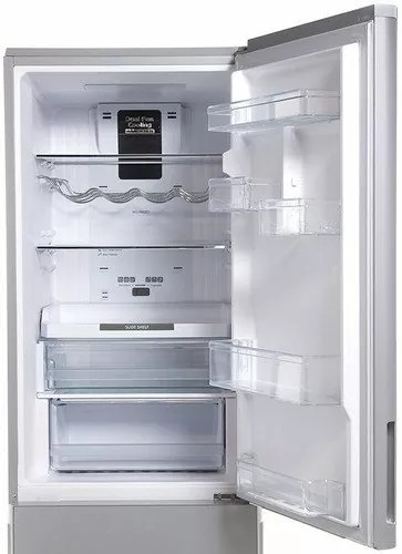 Сверху находится холодильная камера. Внутреннее пространство организовано тремя полками из закаленного стекла, а также винной и выдвижной. Для хранения мяса, овощей и молочных продуктов предусмотрено наличие отделения двойного назначения. Съемные полки имеют высокую прочность, их легко мыть в посудомоечной машине или вручную. В дверце расположены карманы, регулируемые по высоте, присутствует лоток для яиц. Все пространство освещается светодиодной подсветкой.