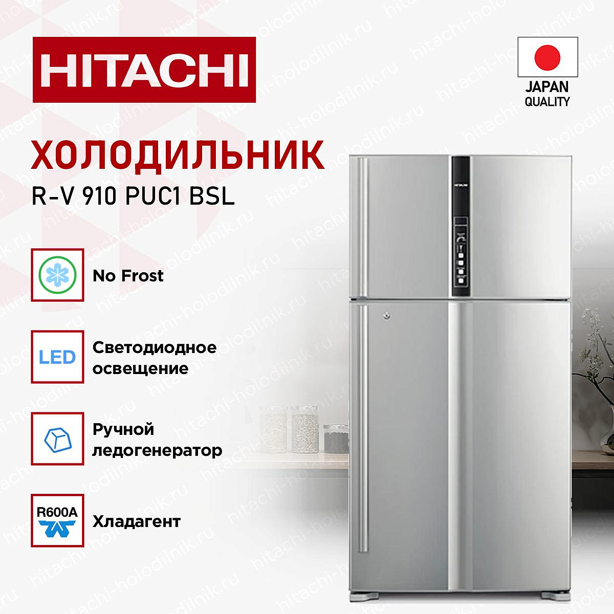 Холодильник Hitachi R-V 910 PUC1 BSL — модель цвета «серебристый бриллиант», имеет увеличенную до 91 см ширину и большой объем рабочих камер. Управление производится при помощи сенсорного дисплея. Прибор не требует размораживания, так как благодаря система NoFrost излишняя влага выводится наружу, иней и лед не образуются на стенках морозильника и упаковках продуктов.