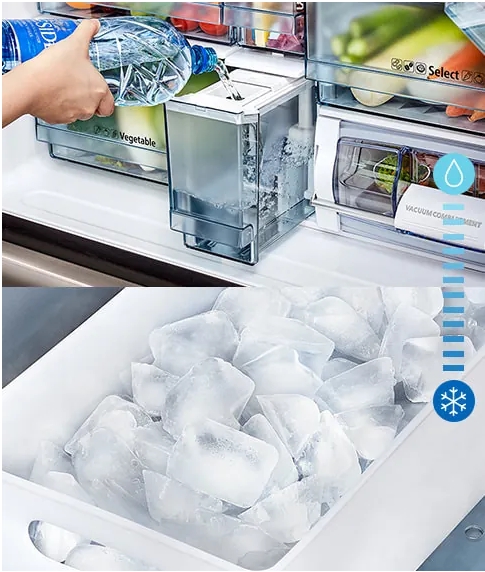 Прибор оснащен автоматическим размораживанием холодильной и морозильной камеры, системой NoFrost и быстрой и глубокой заморозкой. В морозилке также имеется автоматический ледогенератор, который обеспечивает постоянный доступ к льду.